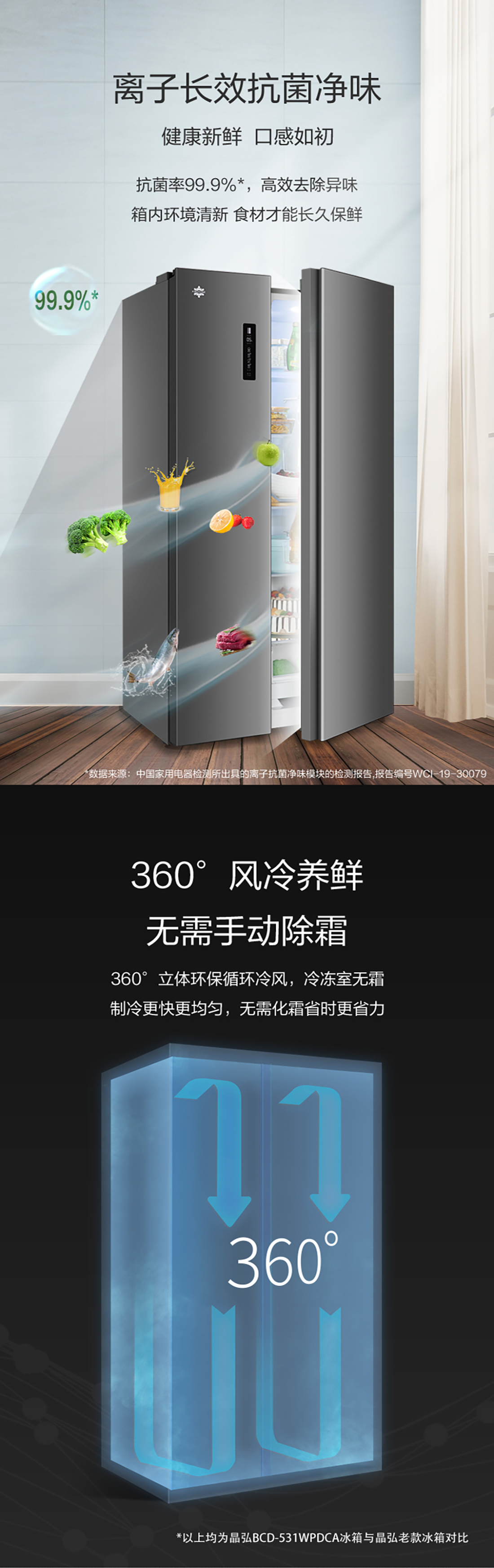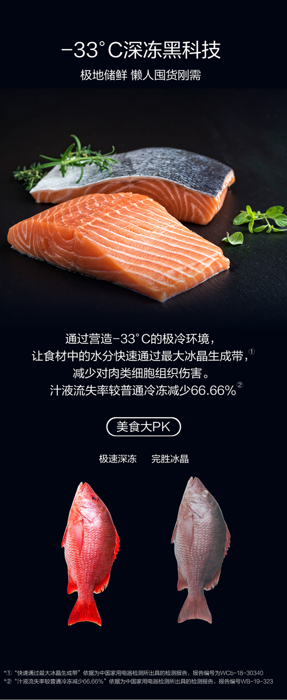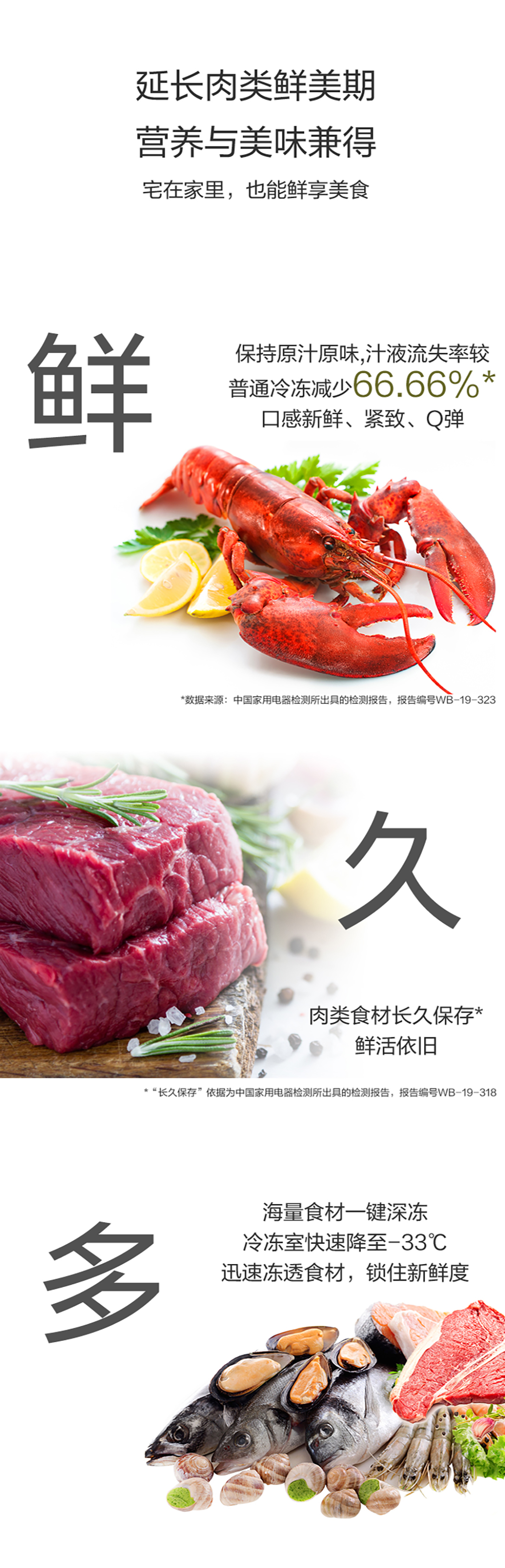 搭載-33℃深凍鎖鮮科技,肉汁飽滿更長久。采用離子長效抗菌凈味,抗菌率高達99.9%。風冷無霜,拒絕風干,食材水潤新鮮。