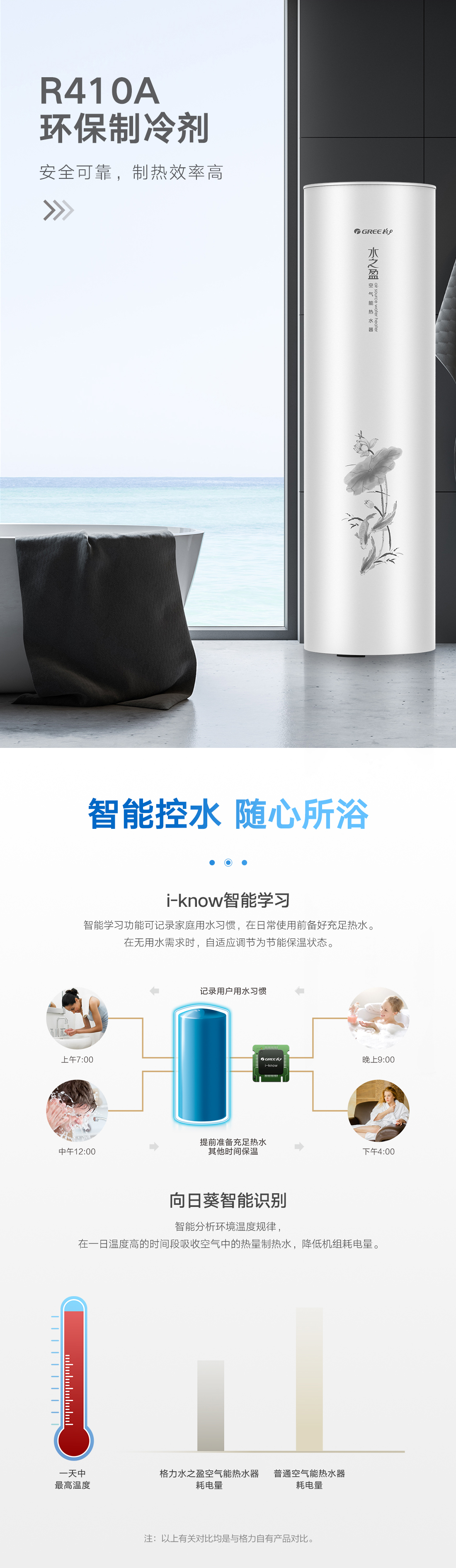 新型環保冷媒,綠色節能更高效,內置增容、向日葵、i-know等個性化功能;給您的沐浴帶來多樣化體驗