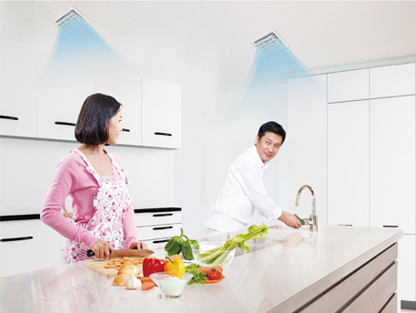 情侶送風:廚享特設雙出風口,開啟時,兩個風口從不同位置出風,增加夫妻搭檔烹飪的樂趣。 定點送風:設置定點送風,直吹人體,能快速降低燥熱感,讓您享受清涼烹飪,同時避免大范圍送風產生的能耗。