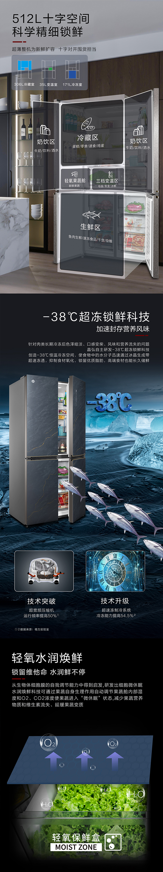 -38℃超凍鎖鮮;PLASMA全空間除菌凈味;平齊不凸出;雙通道循環(huán)散熱