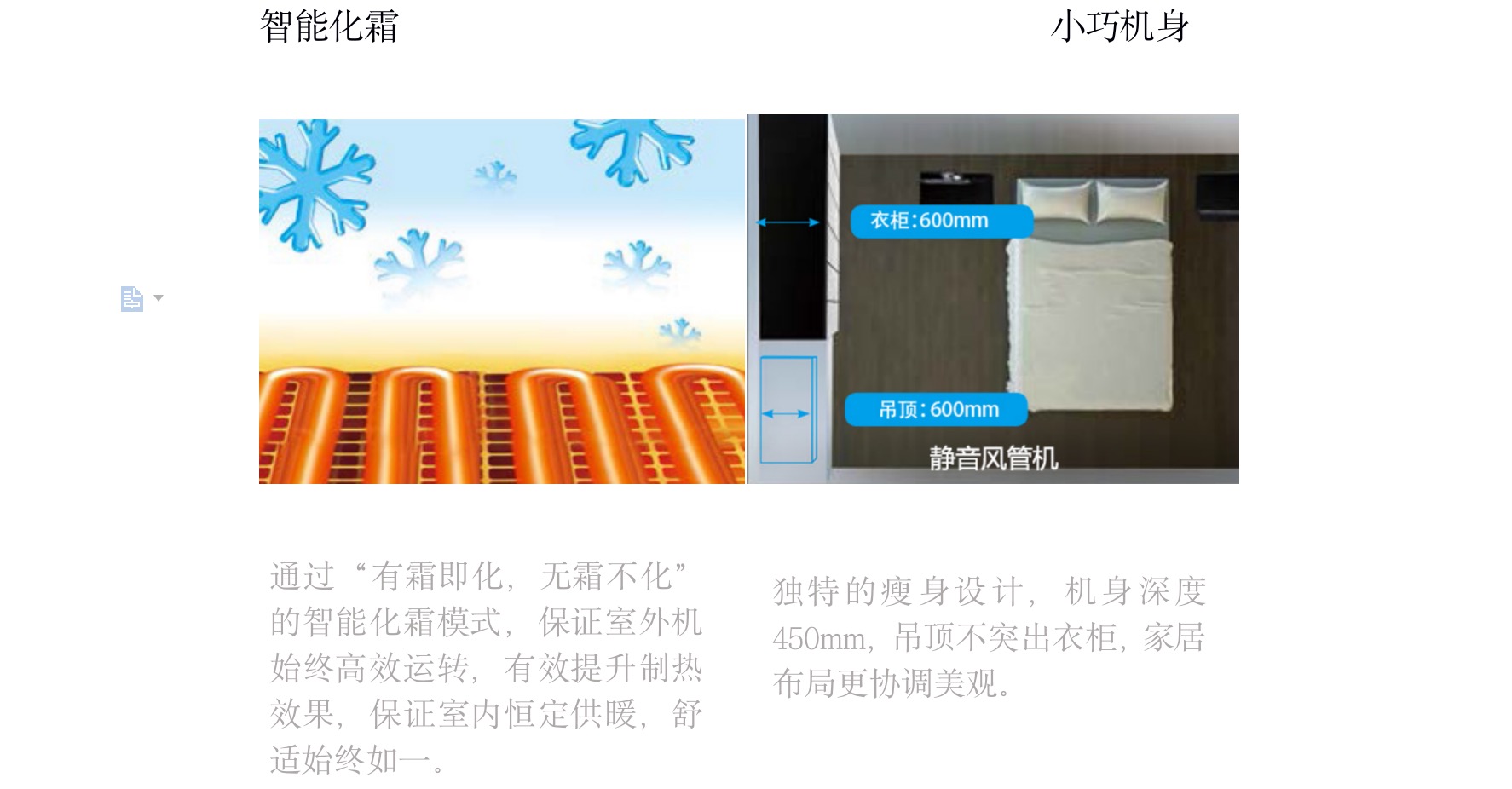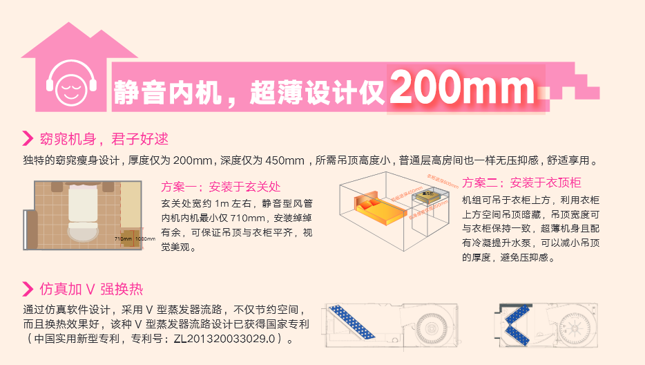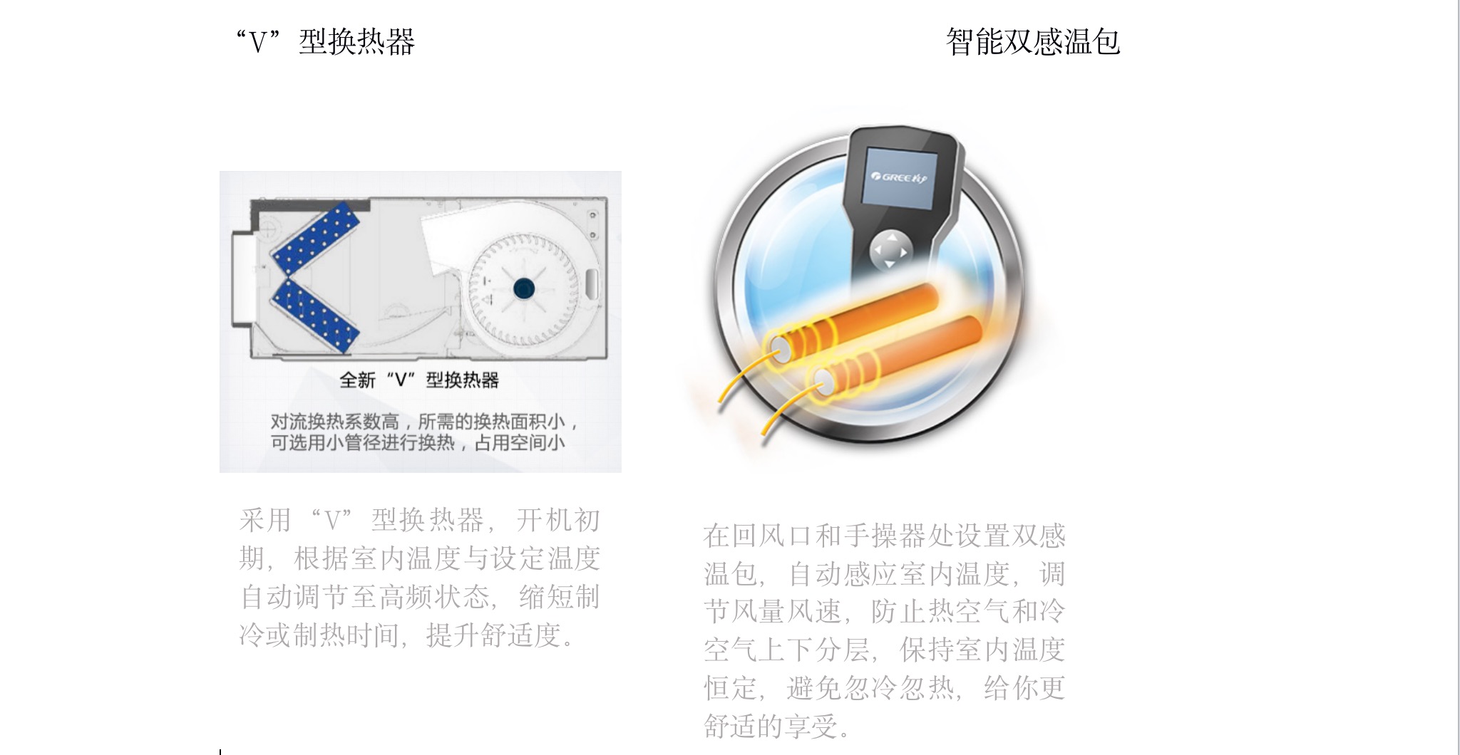 采用“V”型換熱器,開機(jī)初期,根據(jù)室內(nèi)溫度與設(shè)定溫度自動調(diào)節(jié)至高頻狀態(tài),縮短制冷或制熱時間,提升舒適度
